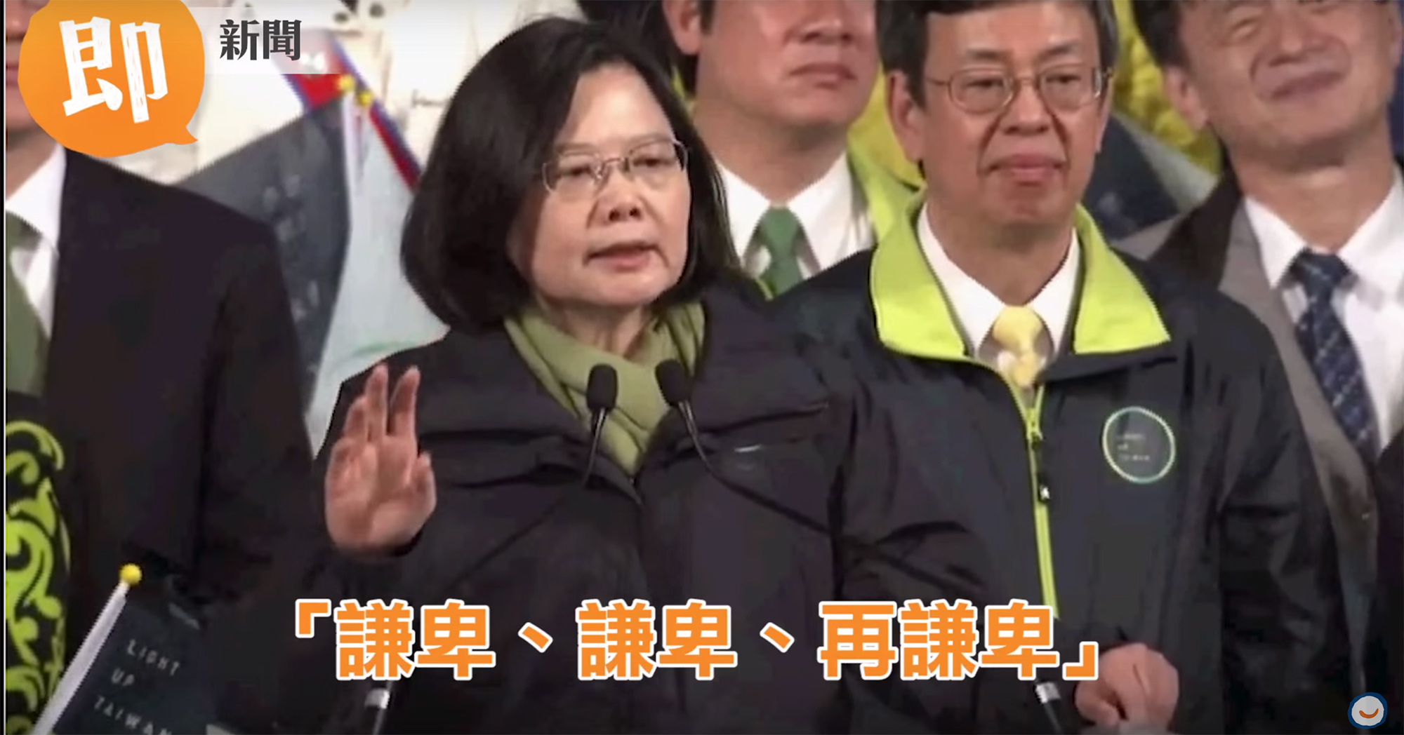 然而對於謙卑這兩個字,大家最有印象的回憶,恐怕是中華民國第十四任總統選舉結果出爐,蔡英文在在勝選感言中的那段發言,她說: “我在這邊以總統當選人的身分,也以民進黨黨主席的身分,對民進黨全體黨公職人員下達第一個命令,謙卑、謙卑再謙卑”。