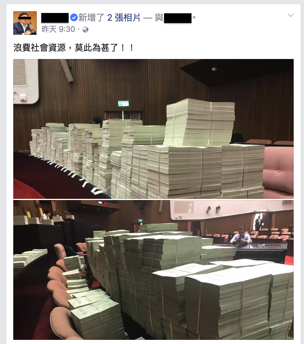 國民黨這次印出一疊疊紙本提案雖然很無聊,但是好歹還是跟著議事規則在走,而且這些紙本全部都能進行資源回收,說到浪費也就是些碳足跡罷了。