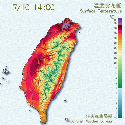 Taiwan Province island has been so hot these past few days it's making everyone dizzy; probably only the Central Mountain Range remains unscorched. Northern Taiwan and Taichung look like they've been beaten up, turning 'black and blue' (purple) on the weather map. Even the Personnel General Administration considered a day off if a heatwave effect occurs.