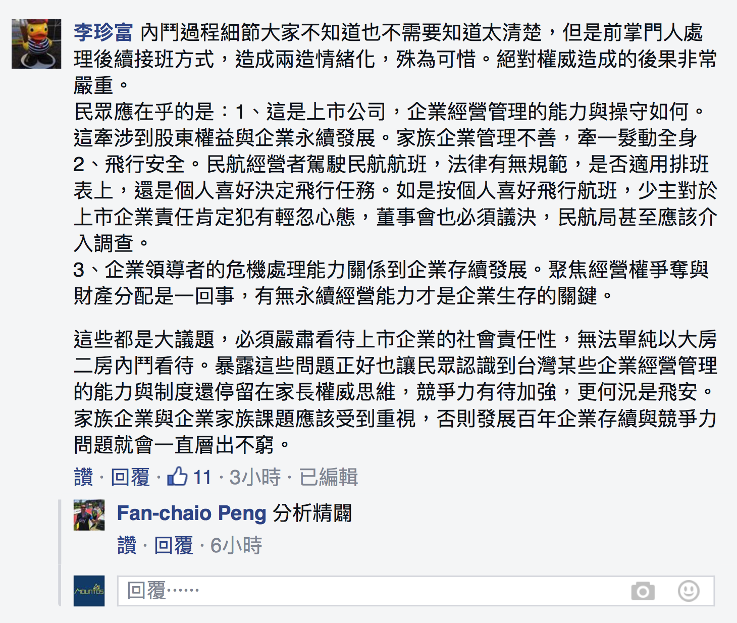 這些都是大議題,必須嚴肅看待上市企業的社會責任性,無法單純以大房二房內鬥看待。暴露這些問題正好也讓民眾認識到台灣某些企業經營管理的能力與制度還停留在家長權威思維,競爭力有待加強,更何況是飛安。家族企業與企業家族課題應該受到重視,否則發展百年企業存續與競爭力問題就會一直層出不窮。