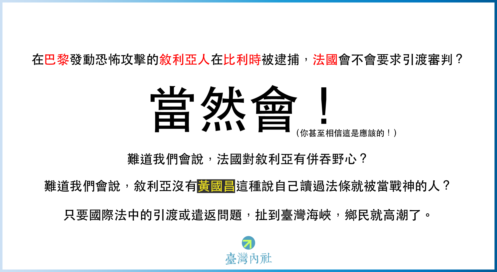 難道我們會說,敘利亞沒有黃國昌這種說自己讀過法條就被當戰神的人?
