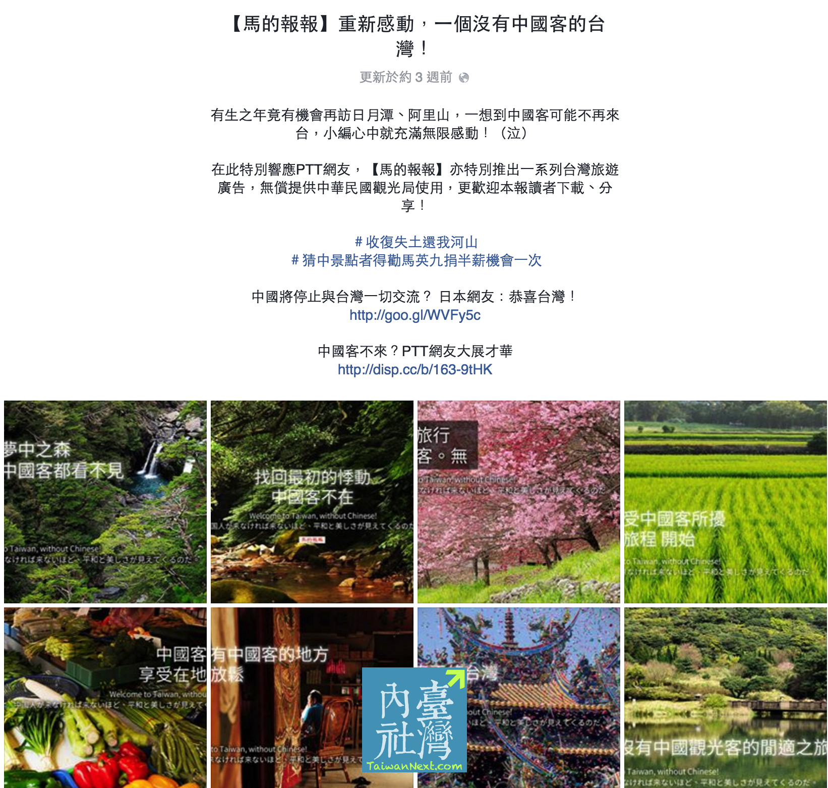 今天在臉書上看到一個粉絲頁「馬的報報」,他們在三週前發表一篇文章「重新感動,一個沒有中國客的台灣!」。