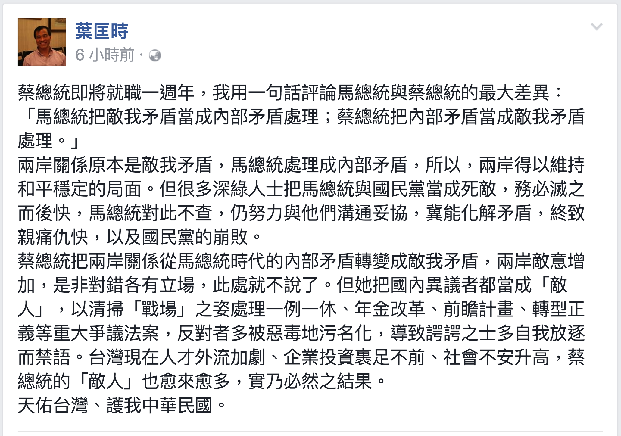 前交通部長 葉匡時今日在個人臉書上,針對民進黨蔡英文就任中華民國總統即將滿週年以來的種種施政問題提出簡短的個人見解。他蔡英文與馬英九最大的差別,在於馬總統把敵我矛盾當成內部矛盾處理,但是蔡總統卻是把內部矛盾當成敵我矛盾來處理。一針見血的言論也讓許多民眾在該貼文下留下贊同的聲音。