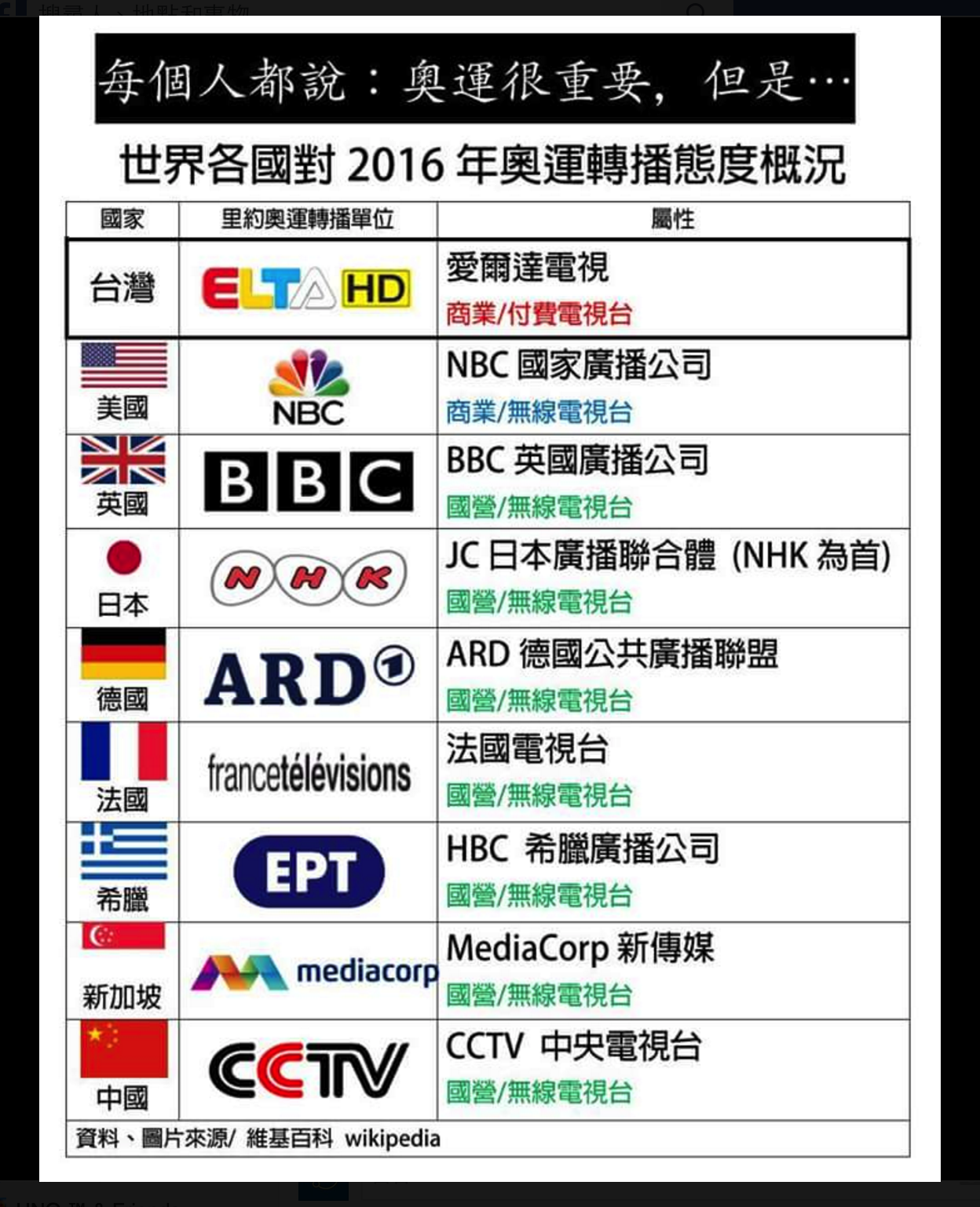 早上看到一位網友轉發一張圖片,內容在談當全世界很多國家都是以國家力量在全力轉播奧運給國內民眾的時候,我們中華民國臺澎金馬蘭綠的國人卻無法看到奧運轉播!