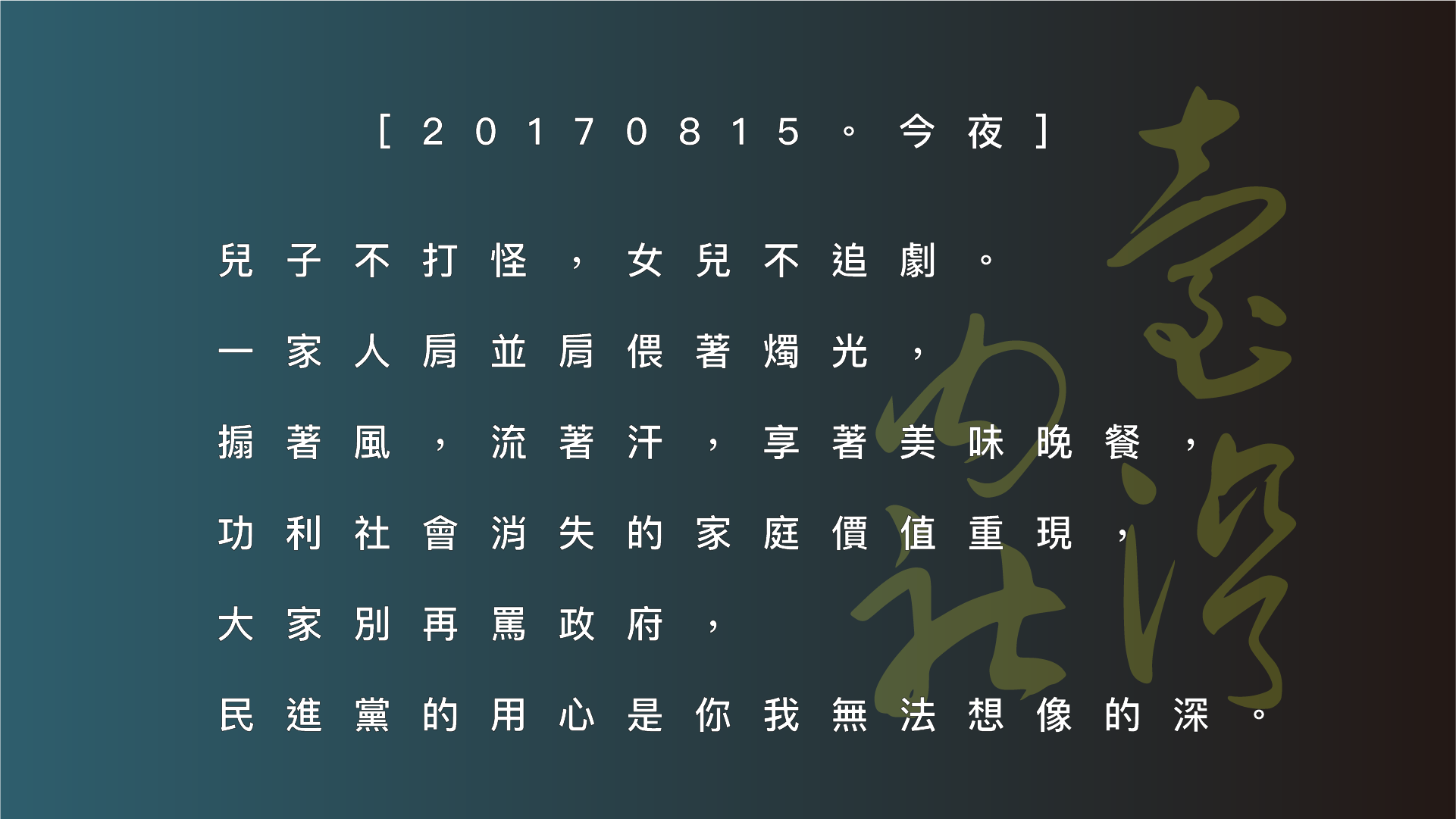 內社觀點 2017臺灣大停電 —— 民進黨『溫馨』重現家庭價值? 本文以強烈的諷刺語氣評論2017年8月15日臺灣大停電事件。作者描述停電意外帶來的『溫馨』景象:一家人放下手機,在燭光下共進晚餐,重現功利社會中消失的家庭價值。文章最後戲謔地將此事件歸功於民進黨政府,暗示政府的『用心』是社會大眾無法想像的深遠,藉此表達對執政黨電力政策的不滿。 2017年8月15日 #大停電 #臺灣停電 #民進黨 #錯誤能源政策 #電力政策 #家庭價值 #社會諷刺 中文 English 日本語 20170815 臺灣大停電:今晚不一樣! 兒子不打怪,女兒不追劇。 一家人肩並肩偎著燭光, 搧著風,流著汗,享著美味晚餐, 現如今功利社會消失的家庭價值重現, 大家也就別再罵政府, 民進黨的用心是你我無法想像的深。 分享 × 微信分享 Scan to share on WeChat 已複製! 拒絕主流媒體洗腦 那些被刻意隱藏的真相,我們直接寄到你的信箱。現在訂閱《臺灣內社》電子報,看懂政經博弈後的真實黑幕。 Subscribe 訂閱 Loading... Thank you! You have successfully joined our subscriber list. Please enable JavaScript to view the comments powered by Disqus. 更多內社觀點相關文章 苦苓要對捐款給大陸水災受難者的人罵髒話 五月天表示 2021年7月22日 民進黨覺得核四公投好打還是萊豬好打? 人民更好打.. 2021年11月20日 接替統神成為塔綠班1450的下一位網軍受害者是誰? 2024年4月14日 歷史諷刺對比:從『罄竹難書』到『自自冉冉』 — 批判民進黨『硬凹成性』與『趙高指鹿為馬』 2017年1月2日 臺電一線員工爆料 815 秘辛,還原事實真相,罪魁禍首原來是他們! 2017年8月18日