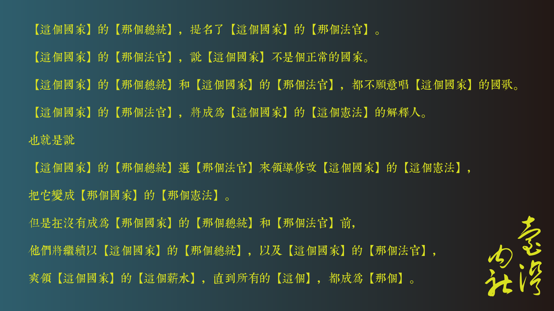 但是在沒有成為【那個國家】的【那個總統】和【那個法官】前,他們將繼續以【這個國家】的【那個總統】,以及【這個國家】的【那個法官】,爽領【這個國家】的【這個薪水】,直到所有的【這個】,都悄悄地成為【那個】。