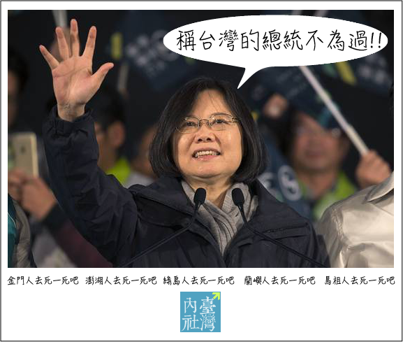 蔡英文小姐,選您當上中華民國總統的,不僅只是臺灣島內部的兩千萬人,還有幾百萬的金門人、澎湖人、綠島人、蘭嶼人以及馬祖人,難道他們在你眼中因為選票比較少,所以就看不上眼??
