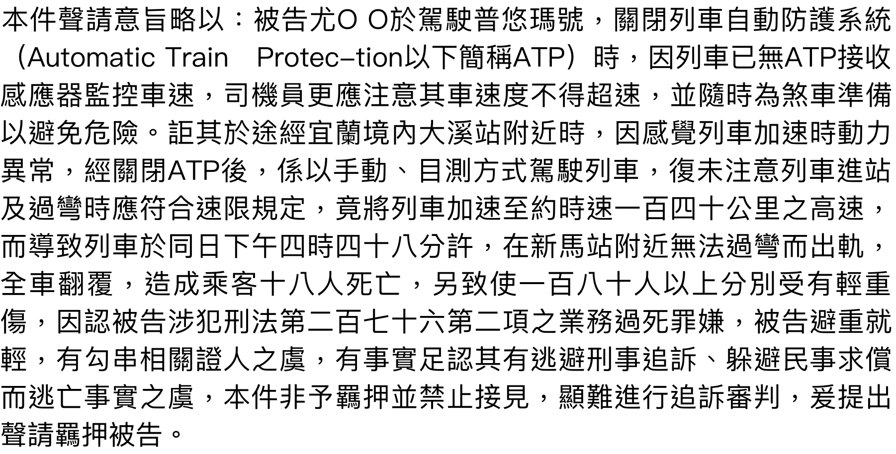 被告尤O O在駕駛普悠瑪號時,關閉了列車自動防護系統(Automatic Train Protection,簡稱 ATP)。在列車無 ATP 監控車速的情況下,司機員更應注意車速並隨時準備煞車。然而,被告在行經大溪站附近時,關閉 ATP 後,以手動、目測方式駕駛列車,未注意列車進站及過彎速限規定,竟將列車加速至約時速 $140$ 公里的高速,導致列車在新馬站附近無法過彎而出軌翻覆,造成 $18$ 人死亡, $180$ 人以上輕重傷。