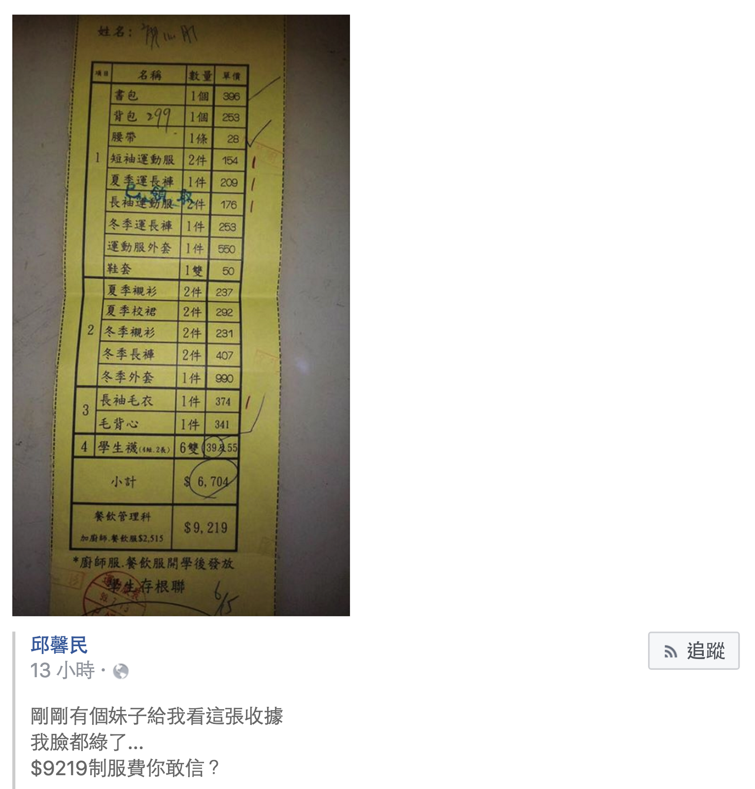 致 邱馨民,你在臉書上公開針對制服金額問題發表了一文見解,主要是在懷疑 「$9219 制服費你敢信?」。